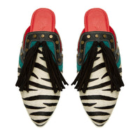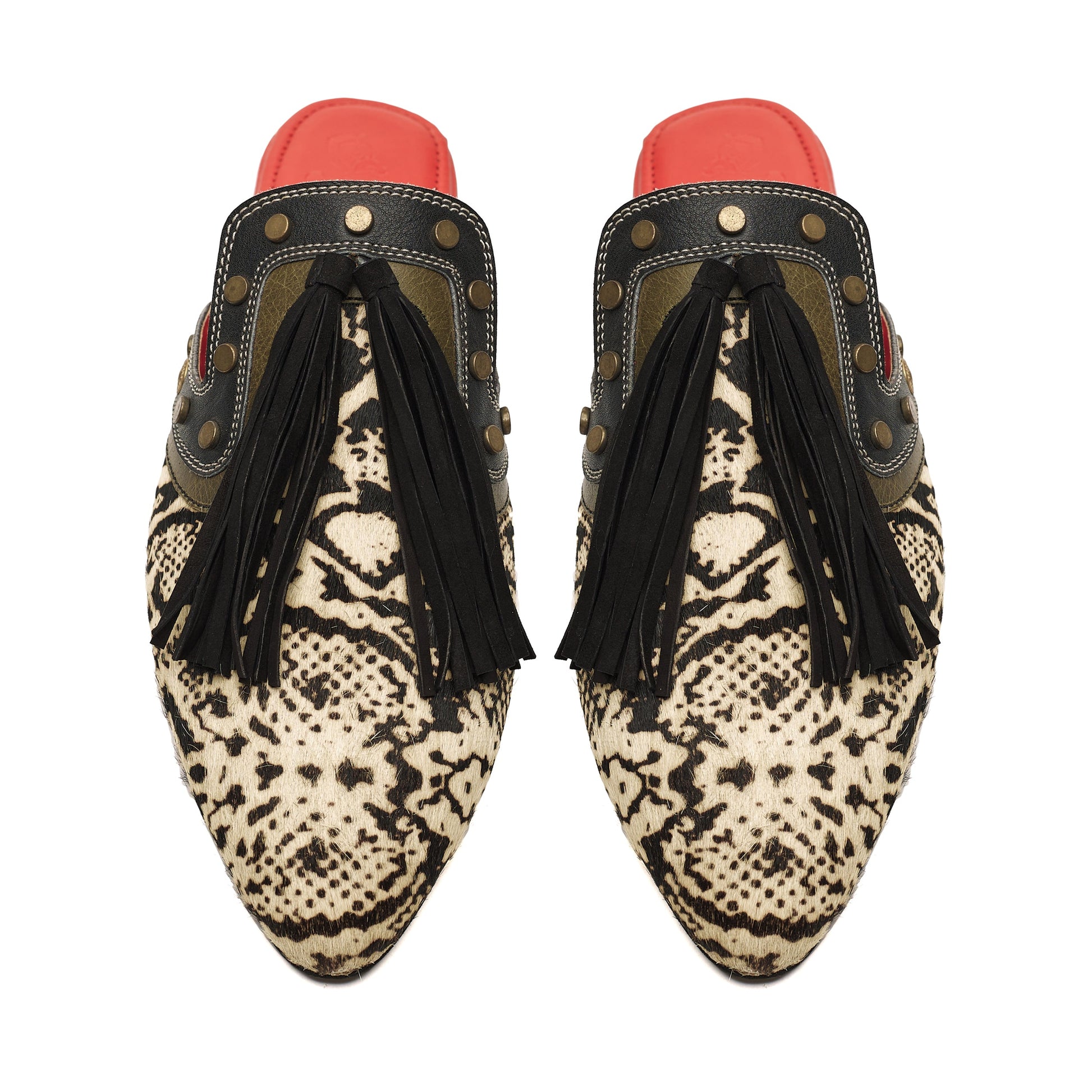 Designed to represent stealth, the Python (cone mules) is a true head-turner. Precise and elegant, the pair is handcrafted by juxtaposing exquisitely patterned leathers. Antique brass embellishments sit at the core of the shoe finishing the look with just enough drama.
