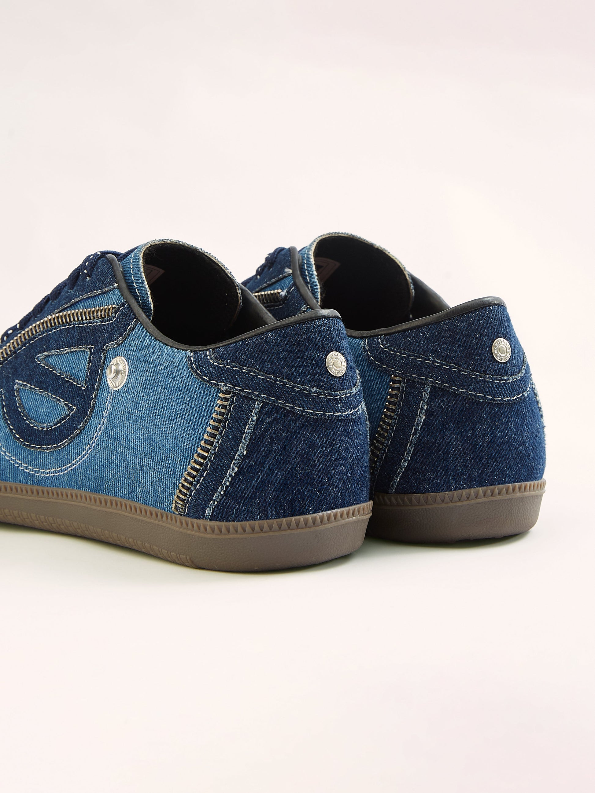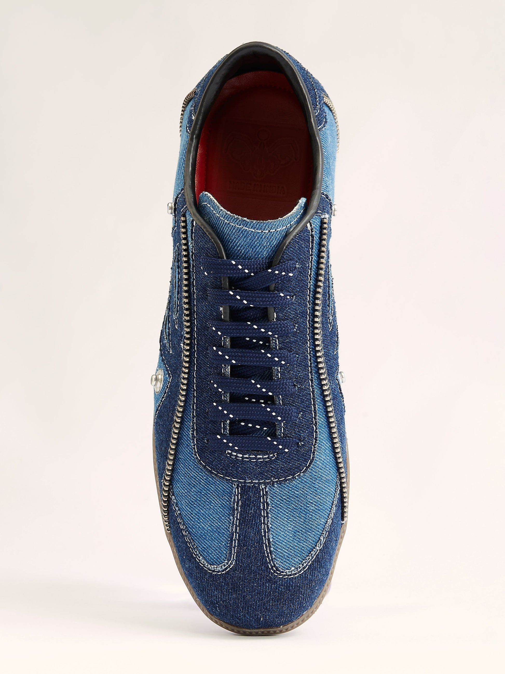 Constructed in denim, a textile historically situated at the intersection of labour, subculture, and anti-establishment dress, it repositions footwear as a site of political expression.